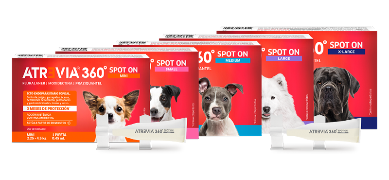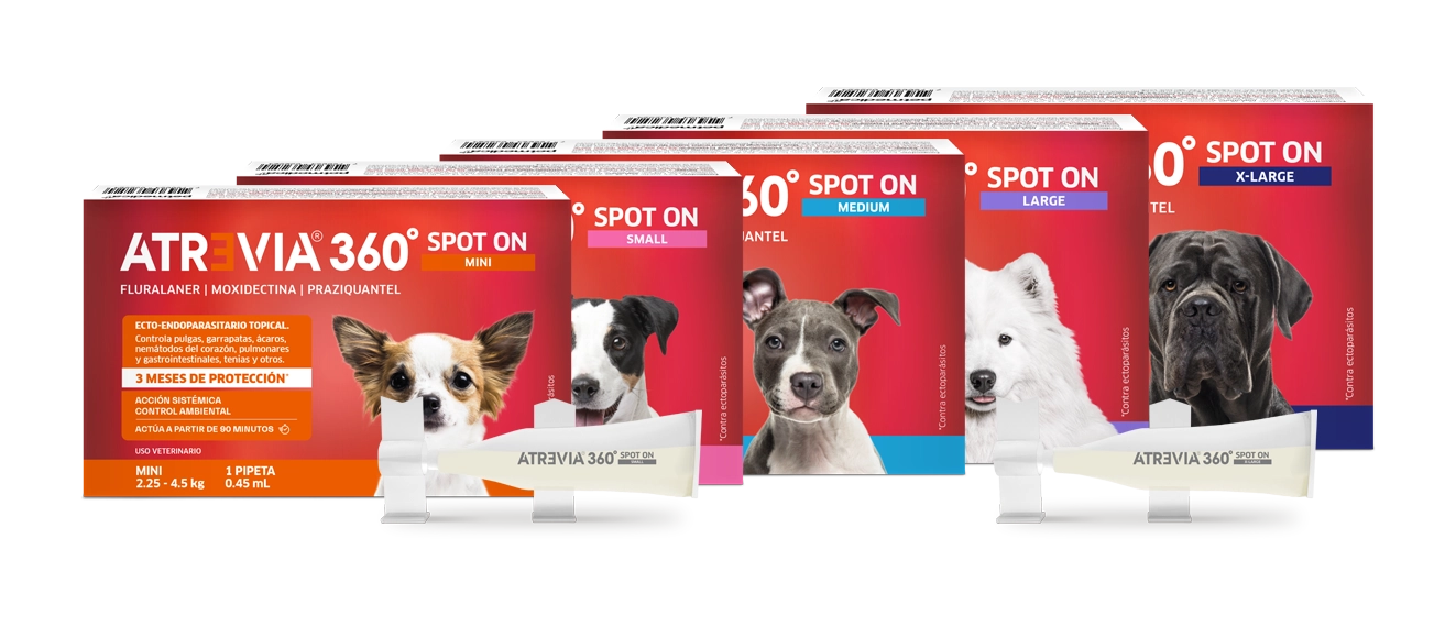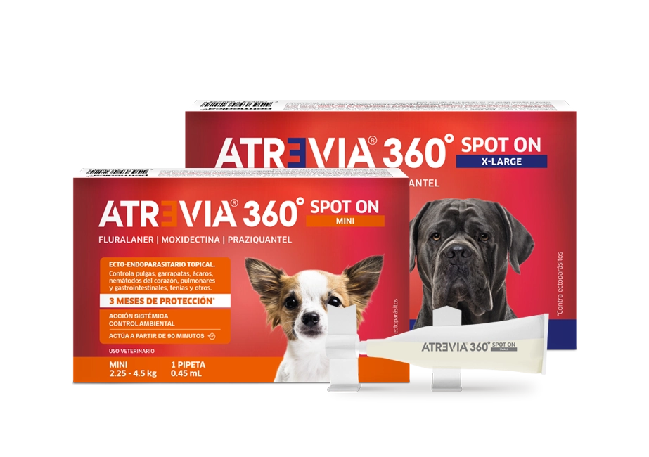 Atrevia® 360 Spot On brinda protección contra los principales parásitos externos e internos en perros. Su dosificación trimestral es la más conveniente para asegurar el cumplimiento del calendario de desparasitación.