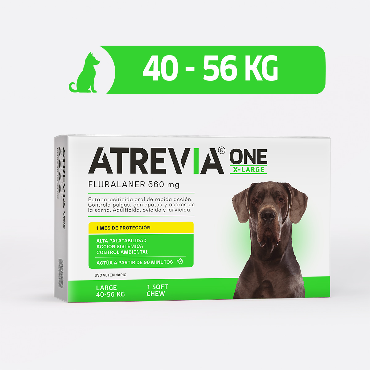 Atrevia® One X-Large otorga un efectivo tratamiento ectoparasitario sistémico contra pulgas, garrapatas y ácaros, en base a fluralaner, que protege a los perros por lo menos por 30 días. Puede utilizarse en animales infestados o como preventivo. Empieza su acción en 90 minutos y mata a las pulgas en 8 horas y a las garrapatas en 12 horas.