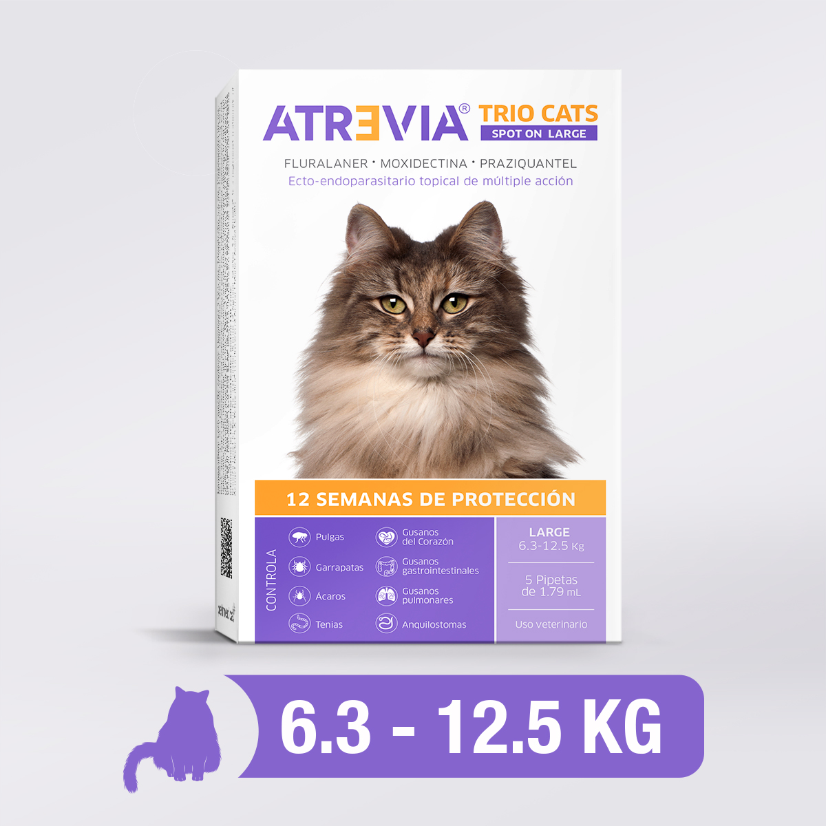 Atrevia® Trio Cats Spot On Large es un novedoso tratamiento antiparasitario sistémico integral, en base a fluralaner, moxidectina y praziquantel que protege a los gatos contra pulgas, garrapatas y ácaros por 12 semanas y contra un gran número de parásitos internos (nematodos gastrointestinales, del pulmón, del corazón, tricúridos, cestodos o tenias entre otros). Puede utilizarse en animales infestados o como preventivo. Controla la infestación de pulgas en el medio ambiente y áreas donde el gato tratado tiene acceso. Empieza su acción en 1 ½ horas, en 8 horas elimina las pulgas y en 12 horas todos los ectoparásitos sensibles.