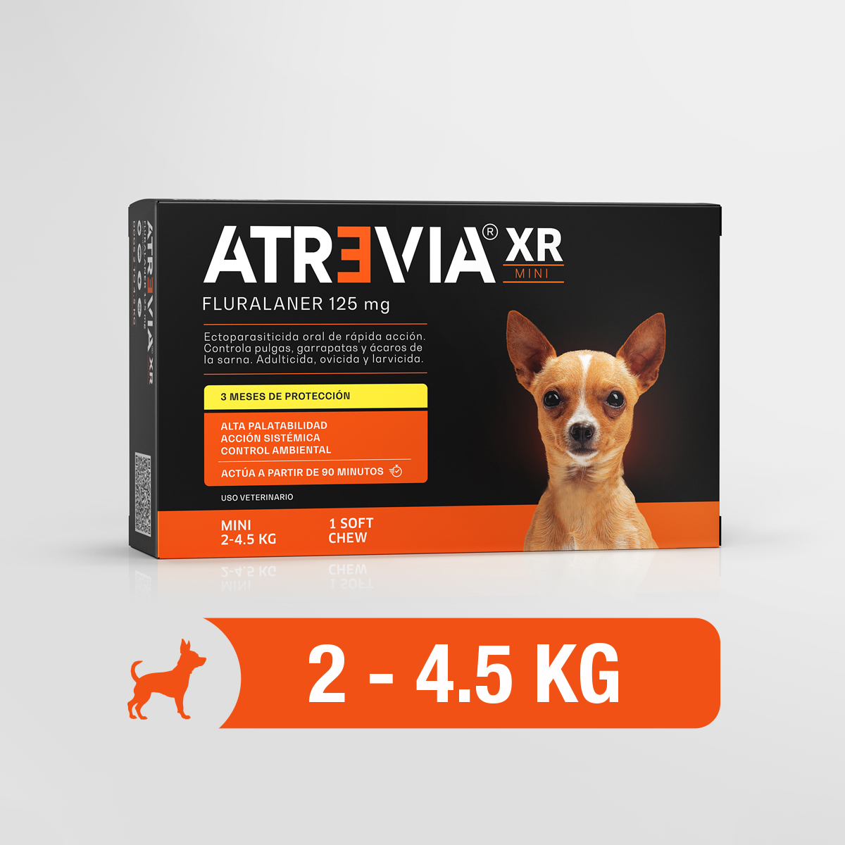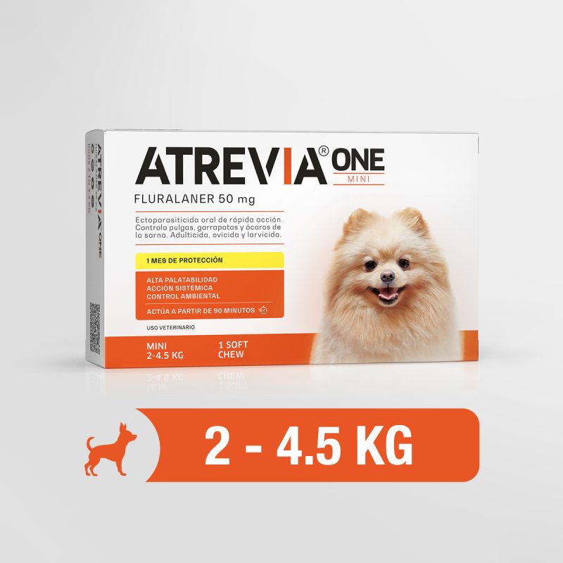 Atrevia® XR Mini otorga un efectivo tratamiento ectoparasitario sistémico contra pulgas, garrapatas y ácaros, en base a fluralaner, que protege a los perros por 3 meses. Puede utilizarse en animales infestados o como preventivo. Empieza su acción en 90 minutos y mata a las pulgas en 8 horas y a las garrapatas en 12 horas.